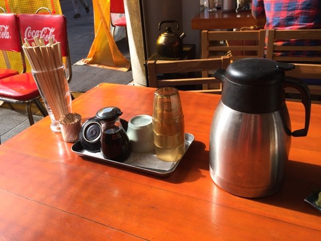 テーブルにはしょうゆとお茶。