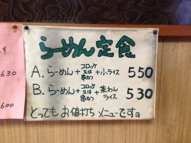 ラーメン定食の串かつ。串カツかコロッケか選べます。串コロといえば両方一つずつ出てきます。