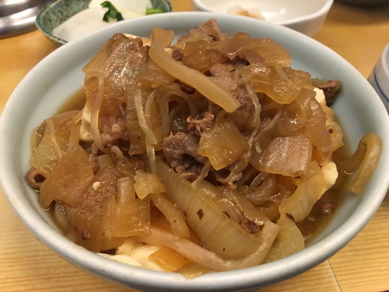 さっと煮られた絹ごし豆腐にドカッと牛丼の頭がかけられています。