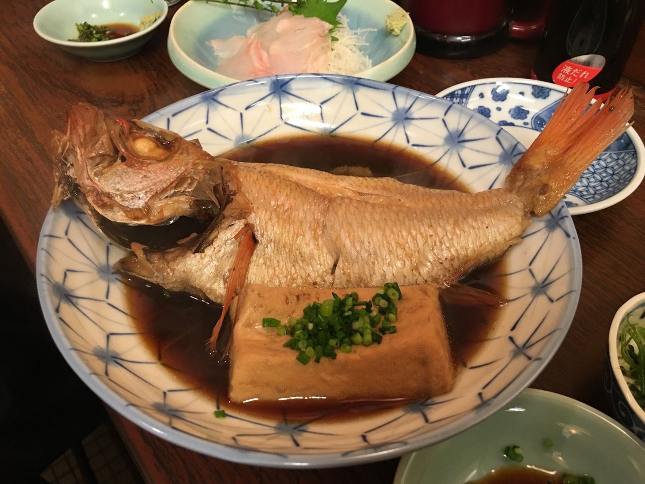 アカムツ(のどぐろ)煮付、刺盛り(青鯛、黒ムツ)、野菜煮@かとう