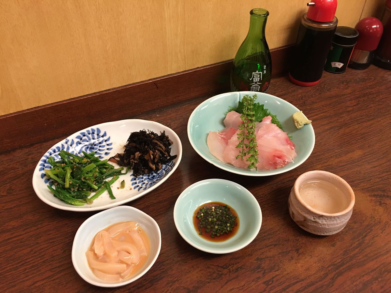 カワハギ煮付け、刺身盛込み(松川カレイ、青鯛)、野菜煮@かとう