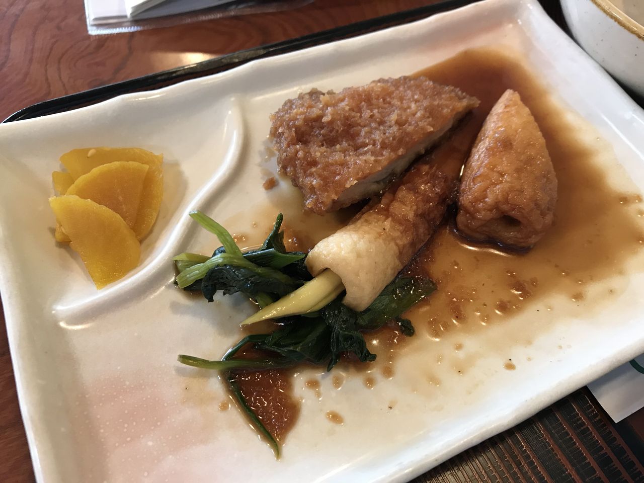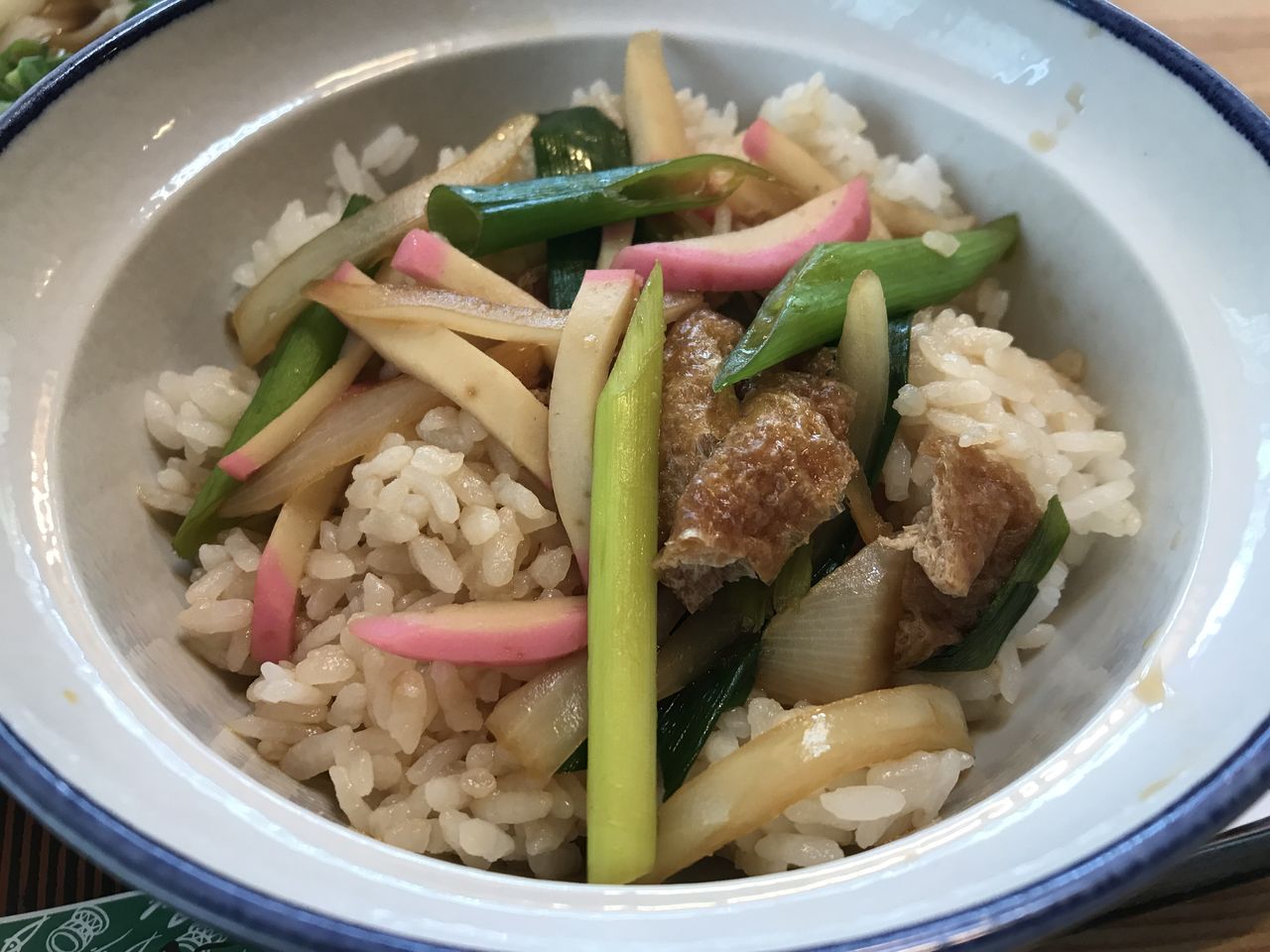 竹輪、イカ天、カツ、ネギの豪華なおかずでご飯を頂きました。