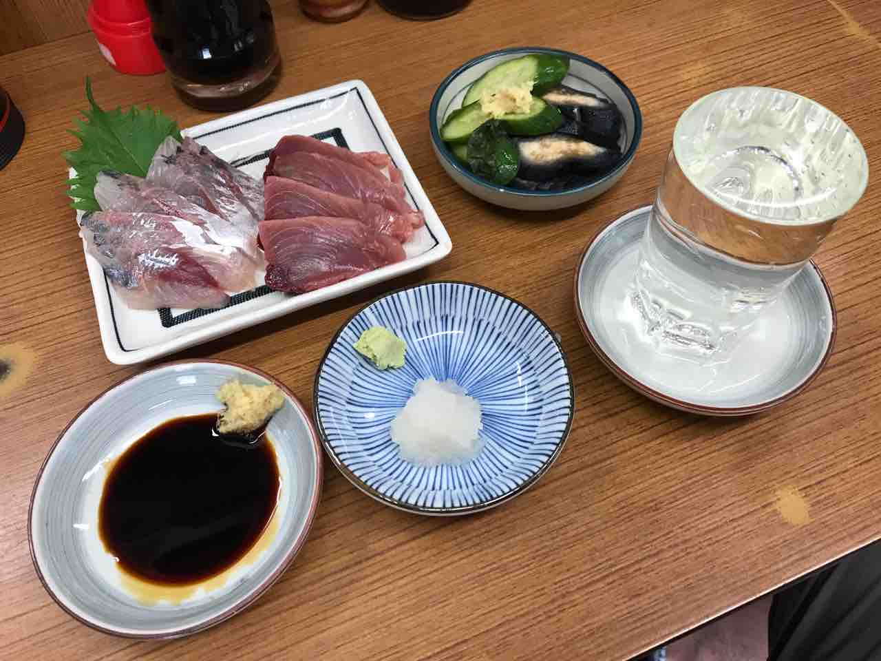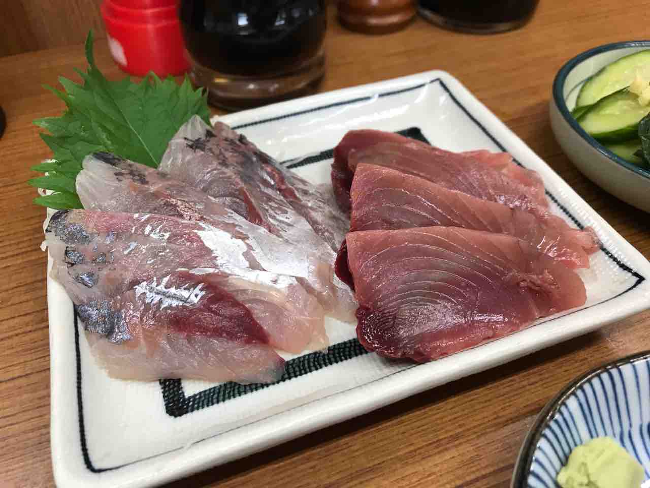 鰹刺、鳥貝、鰤頭肉、蛍烏賊沖漬け@魚源食堂