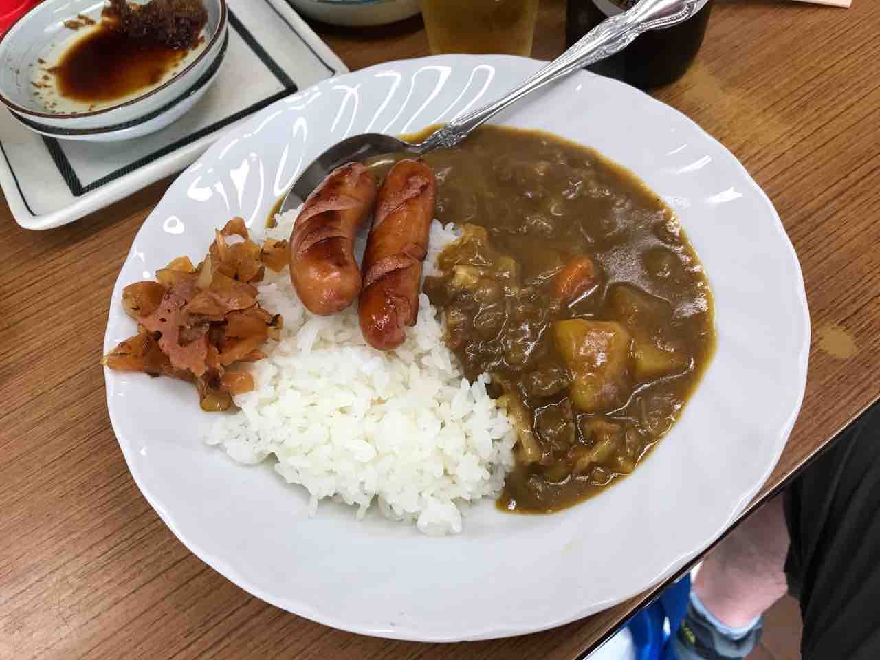 鮃刺、鳥の肝煮、鰻、茹でイカ、アスパラ、ウインナーカレー、味噌汁@魚源食堂