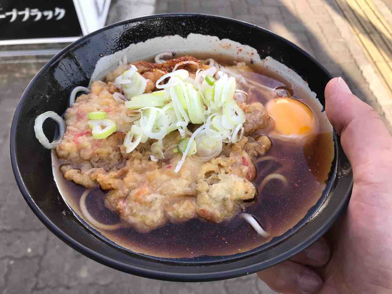 パックの麺を湯通しして、揚げ置きの天ぷらを載せ、卵をぱかっと割り、色目の濃い汁をかけ、刻み葱を盛った代物を、駅の雑踏の中に立ち尽くし啜る。味云々ではなく、細胞が喜ぶんですよ!これホントの話。