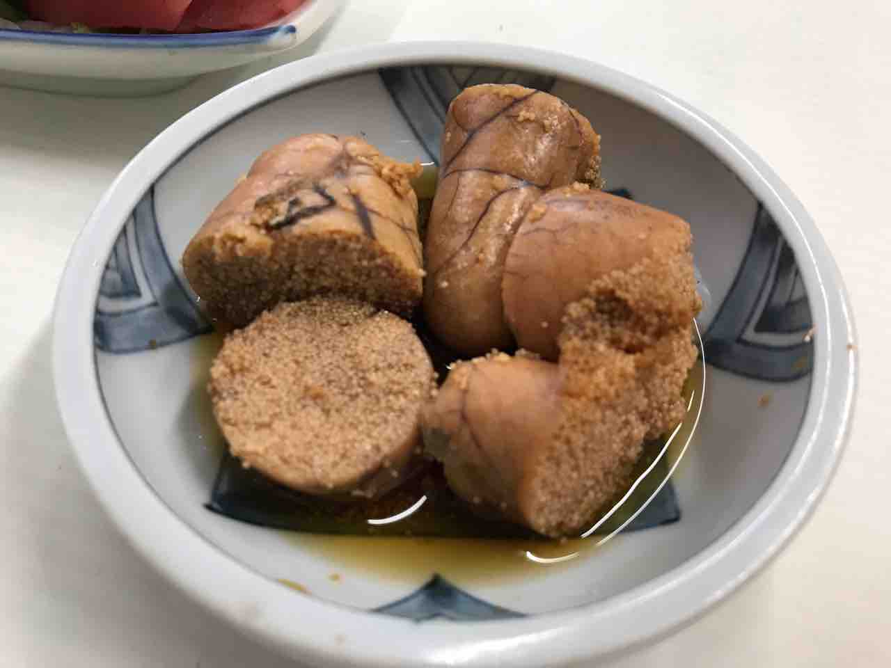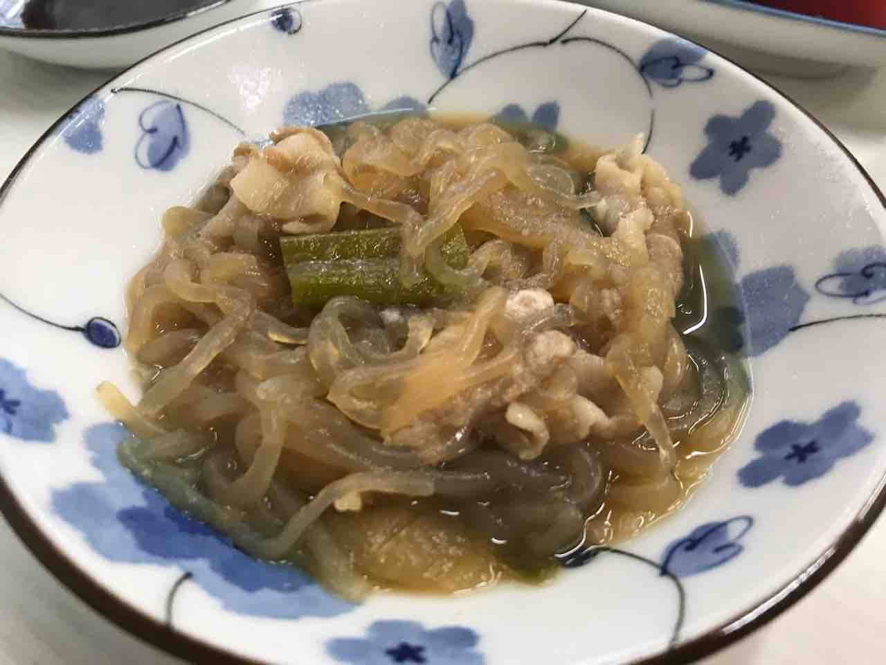 鮃刺、長葱煮、糸コン煮、明太子@魚源食堂