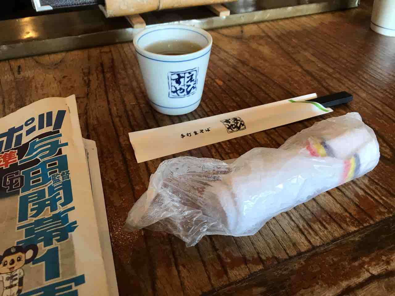 スポーツ新聞を確保し、着席するとお茶にお絞りにお箸が提供されます。