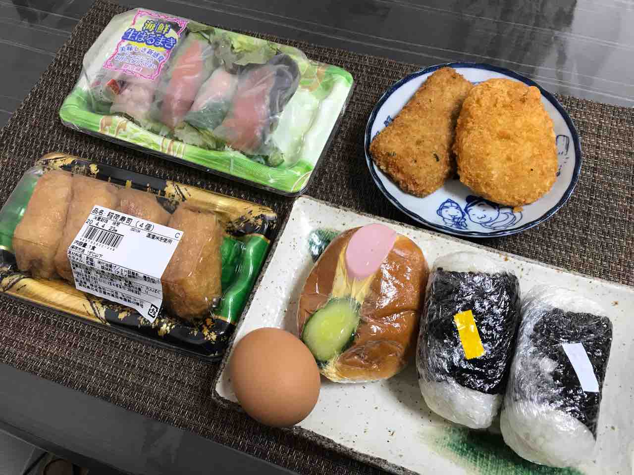 本日の昼食は、おにぎり、いなり寿司、卵サンド、コロッケ、烏賊の香草揚げに汁物をつけて終了となりました。