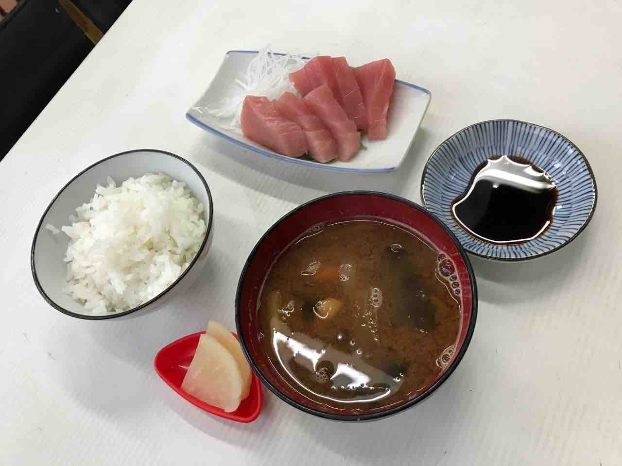鮪刺、もずく、鯖塩焼き、烏賊ゲソ、ソーセージカレー@魚源食堂