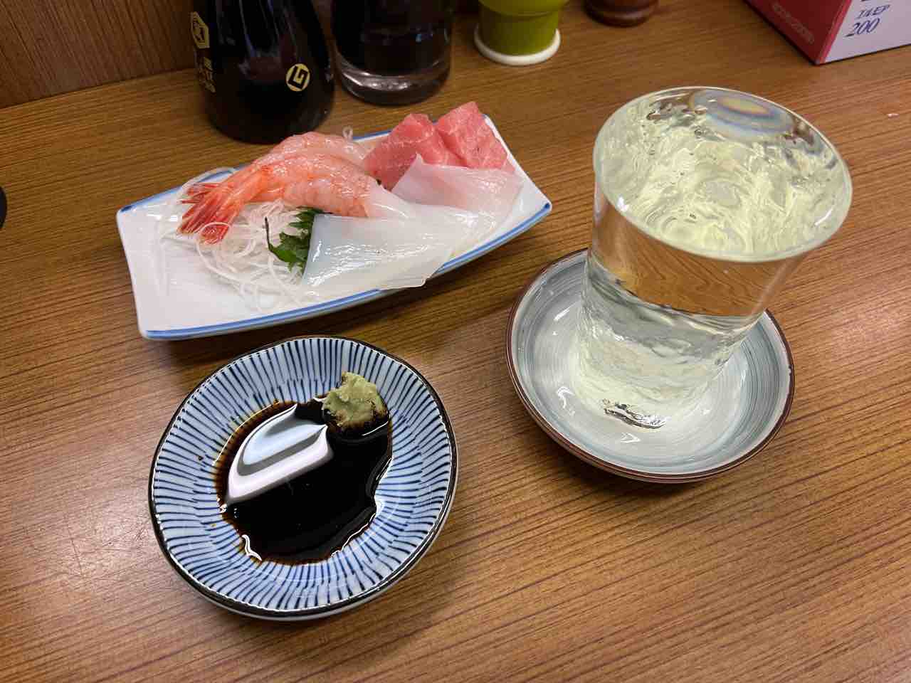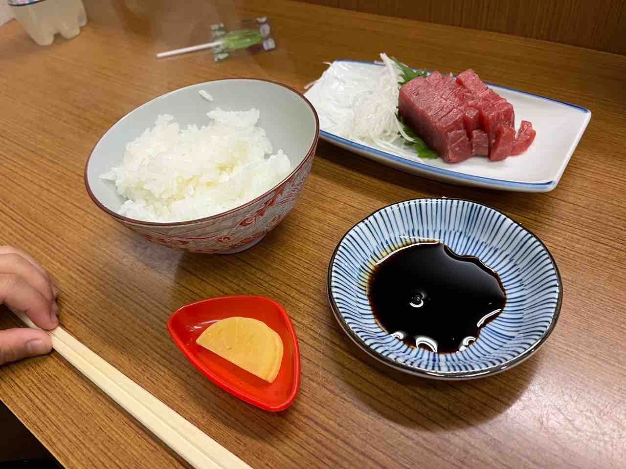 魚源さんはカウンターに並んだお惣菜から好みのものを選び、ご飯大中小に汁の有無を注文する一膳飯屋スタイル。お刺身は大将かお姉さんに聞くと本日のお刺身を出してくれるんですが…。