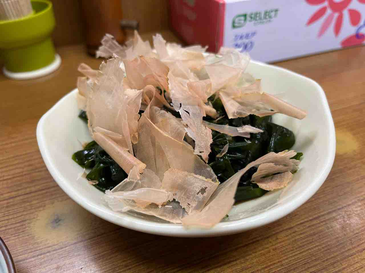名古屋品質なもんで、花かつおどっさりで若芽が見えませんな。本日はポン酢で生姜を添えていただいております。