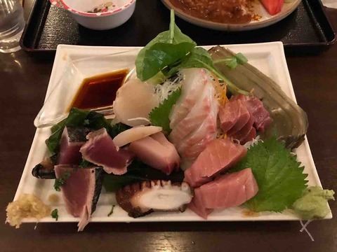 市場で鮪・甘海老刺、ダツイモ、鯖の塩焼き、アジフライ@魚源食堂(柳橋中央市場、愛知県名古屋市中村区名駅)