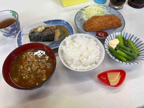 市場で鮪刺、鯖塩焼、アジフライ、アスパラ@魚源食堂(柳橋中央市場、愛知県名古屋市中村区名駅)