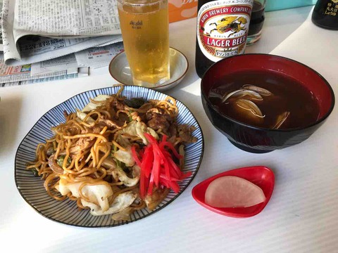 市場で鯖の塩焼き、鮑の煮付け、十六ささげ、焼きそば、貝汁@魚源食堂(柳橋中央市場、愛知県名古屋市中村区名駅)