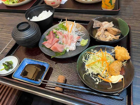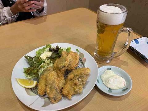 市場で鮪・烏賊刺、カキフライ、鯖の塩焼き@魚源食堂20250222(柳橋中央市場、愛知県名古屋市中村区名駅)