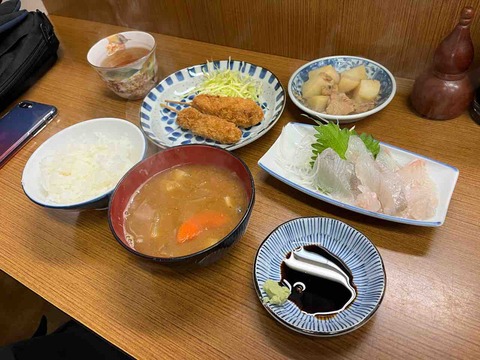 市場で鮪・鮃刺、目張煮、カキフライ、ハンペイ@魚源食堂2025308(柳橋中央市場、愛知県名古屋市中村区名駅)