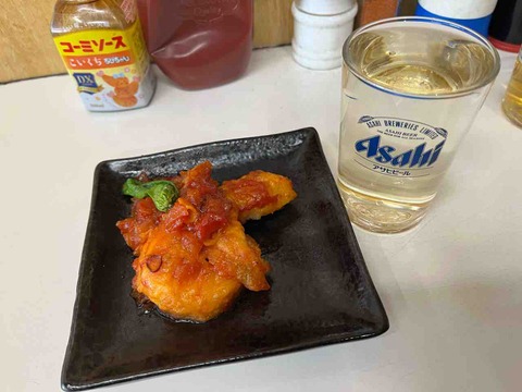 市場でカキフライ、エビチリ、牡蠣と帆立のホワイトソース和え@天末食堂20241128(名古屋市中央卸売市場本場、愛知県名古屋市熱田区川並町)