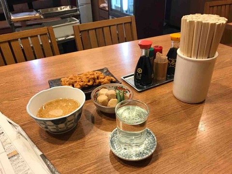 市場でヒラメ&カキフライ、平目刺し、揚げ出し豆腐、かぶらのなます、ソーセージ@魚源食堂(柳橋中央市場、愛知県名古屋市中村区名駅)